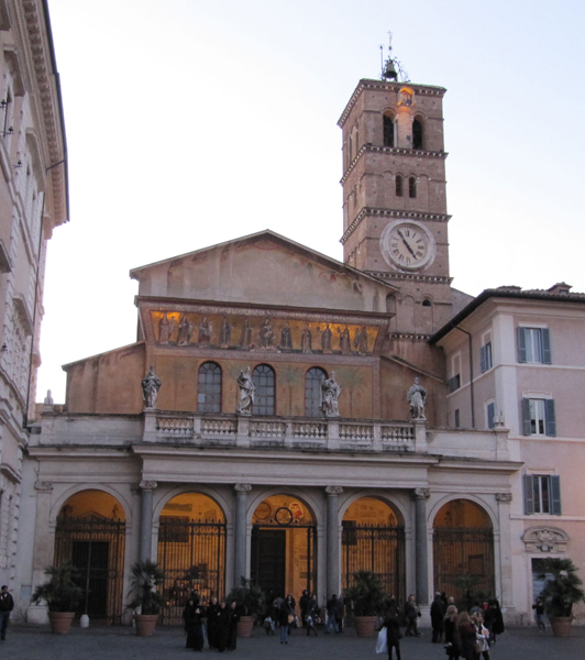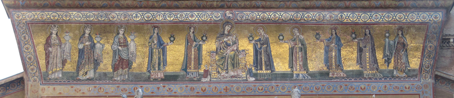 The top of the façade retains a mosaic of the thirteenth century, attributed to Pietro Cavallini, which depicts Mary with the Child, while to the sides ten women are carrying lamps.