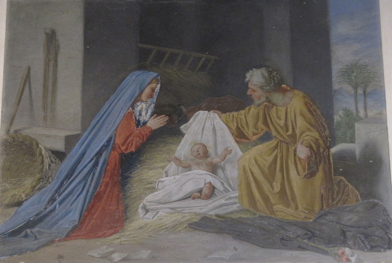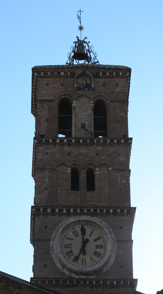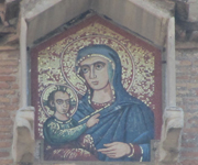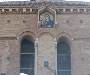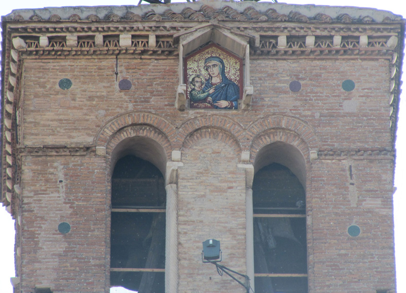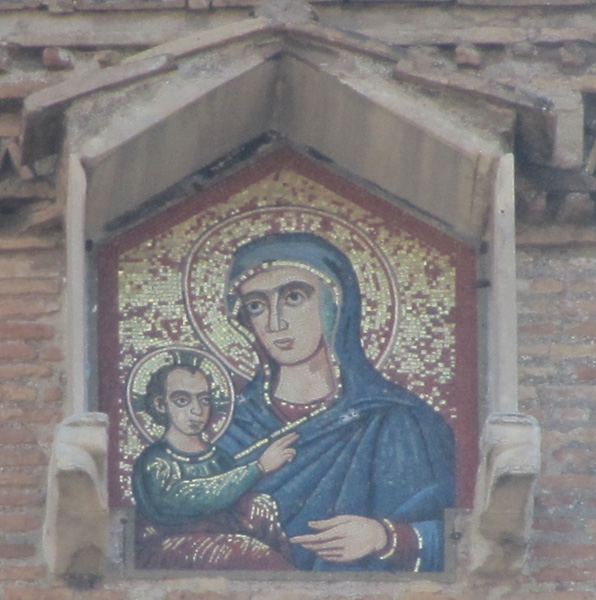 On top of the bell tower, in a niche, a mosaic depicts Madonna and Child.